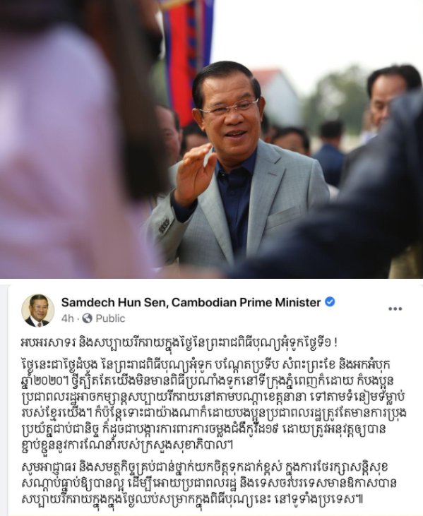 总理写道:“今天是送水节的第一日。即使我们在金边没有进行赛龙舟的活动,但根据我们柬埔寨的传统,广大民众仍可以在各省玩耍。不过,洪森总理也提醒,广大民众必须始终保持警惕,并严格遵守卫生部的指导方针,防止疫情的传播。”