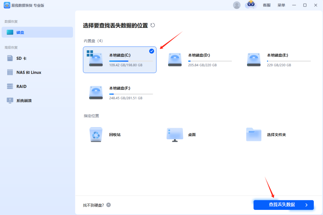 1.启动易我数据恢复,选择文档所在磁盘,点击“查找丢失数据”按钮,开始扫描。