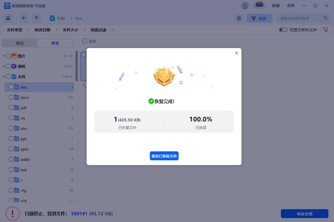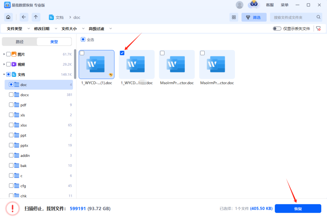 3.在确认文档无误后,点击“恢复”,选择保存路径并点击“保存”。切记不要将找到的文档保存到源盘,避免之前数据再次被覆盖。
