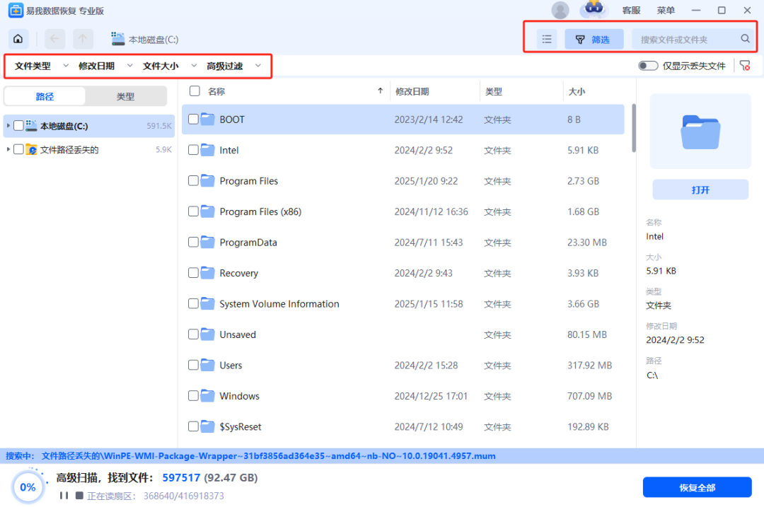 2.点击软件右上角的搜索框,可指定搜索“未保存的文件”,对于扫描到的文件都支持免费预览。