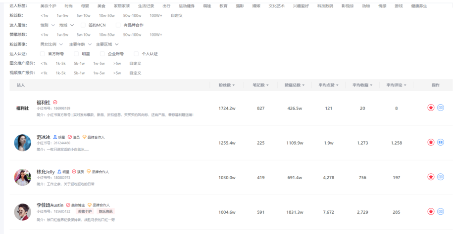 1、达人搜索:查看达人粉丝、新增笔记,平均点赞、平均收藏、平均评论,从性别、年龄、地域、粉丝兴趣多方面了解达人粉丝画像,对标目标用户,帮助商家实现精准投放;提供图文视频推广报价服务,快速达成商业合作。