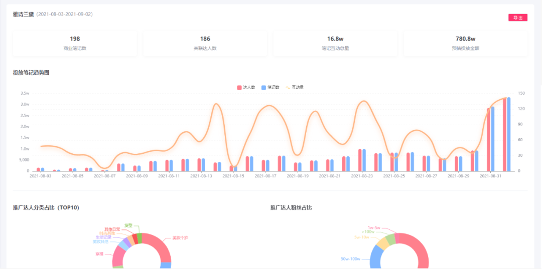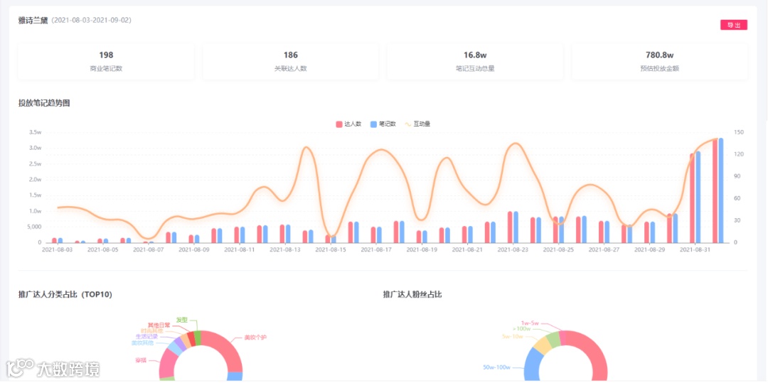 5、监测、对比、投放:支持笔记即时监测和预约监测,精准跟踪笔记互动情况;支持对品牌某一时间内的商业笔记进行统计分析,了解投放效果和达人投放表现,并支持投放报告的导出。