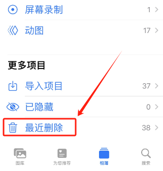 第二步:在“相簿”中往下翻,您可以在“更多项目”的选项下,看到“最近删除”的按钮。