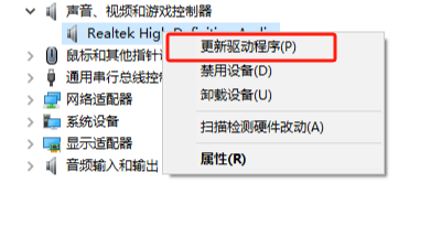 右键单击选中声音驱动,尝试更新驱动程序。