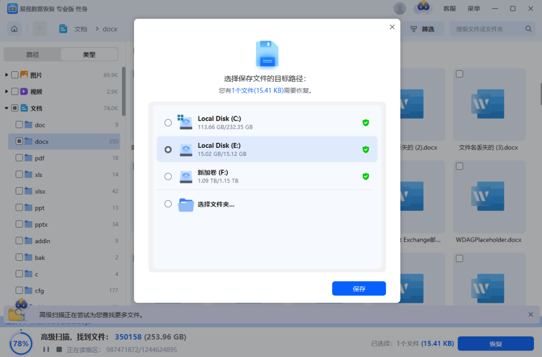 导出数据:勾选要恢复的文件,点击“恢复”,然后选择安全存储路径(避免覆盖原位置),完成恢复。