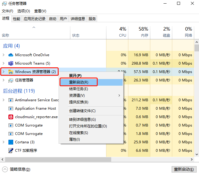 4.在键盘上同时按下【Shift+Ctrl+Esc】打开任务管理器,右键【Windows资源管理器】,选择【重新启动】;