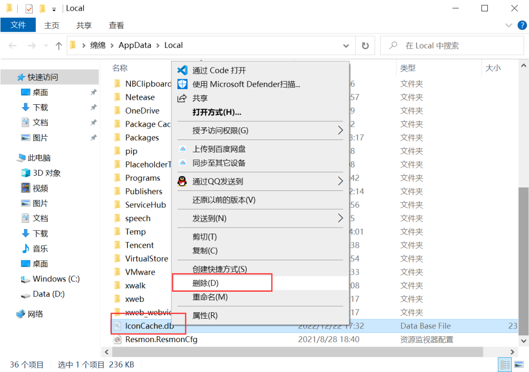 3.右键【lconCache.db文件】,选择【删除】;