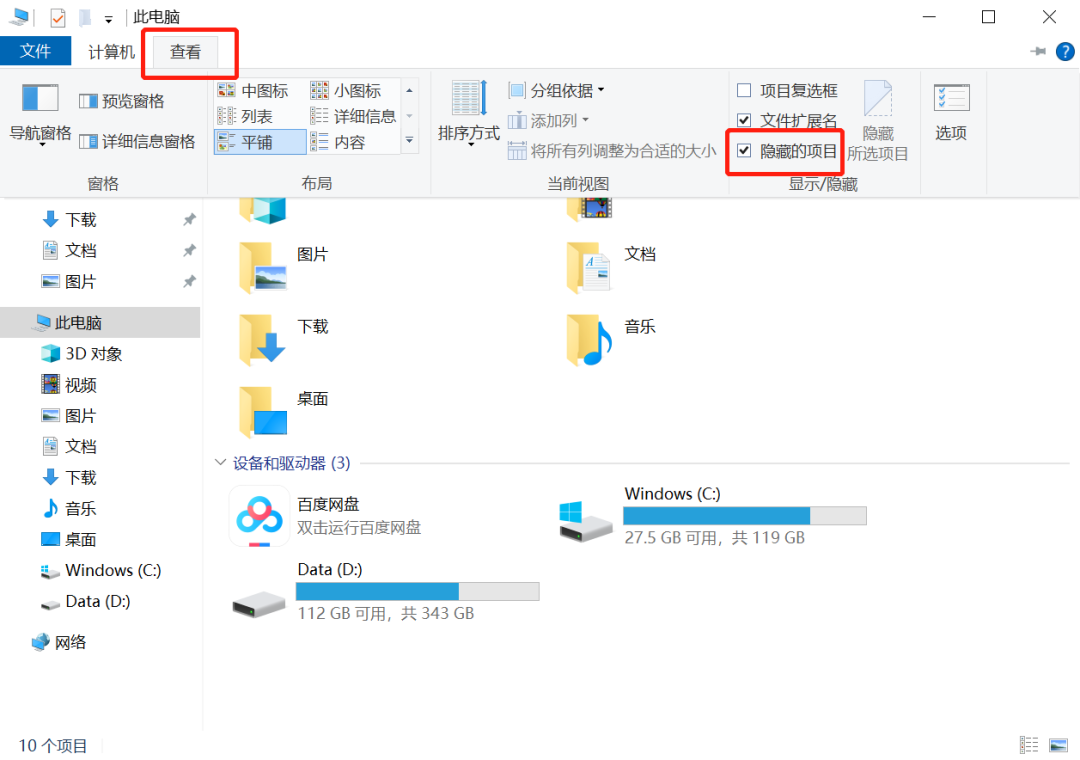 1.双击打开桌面【此电脑】,点击左上方【查看】,勾选【隐藏的项目】;