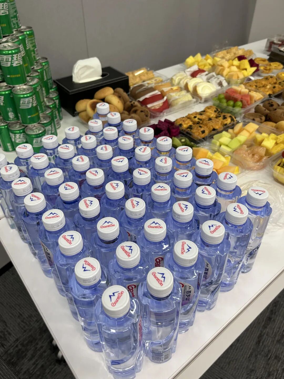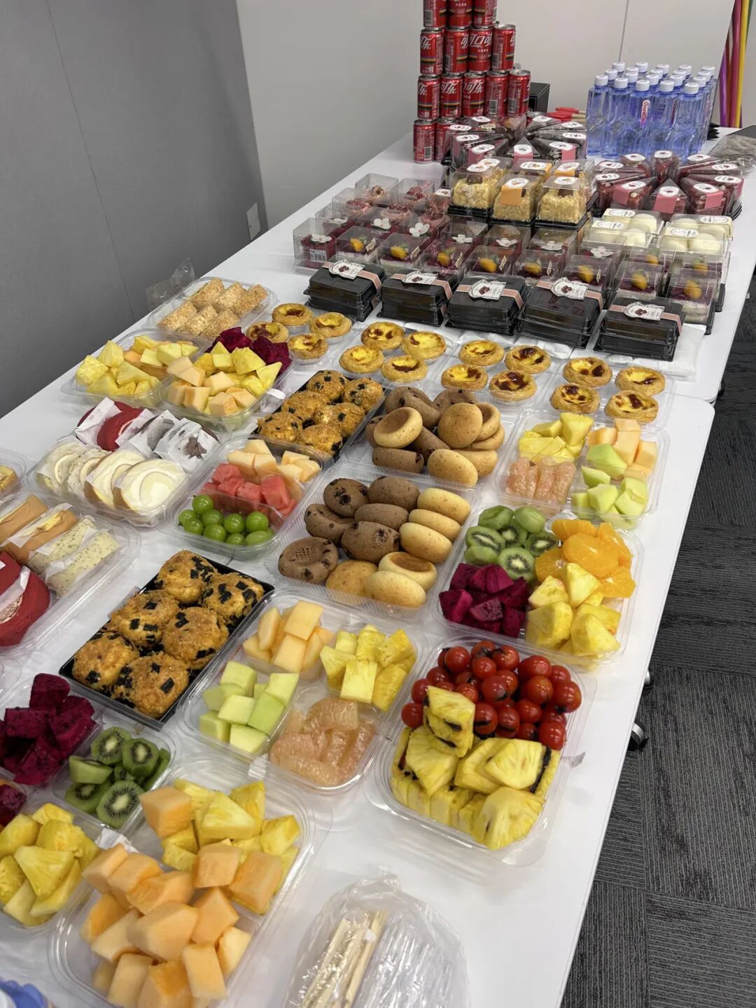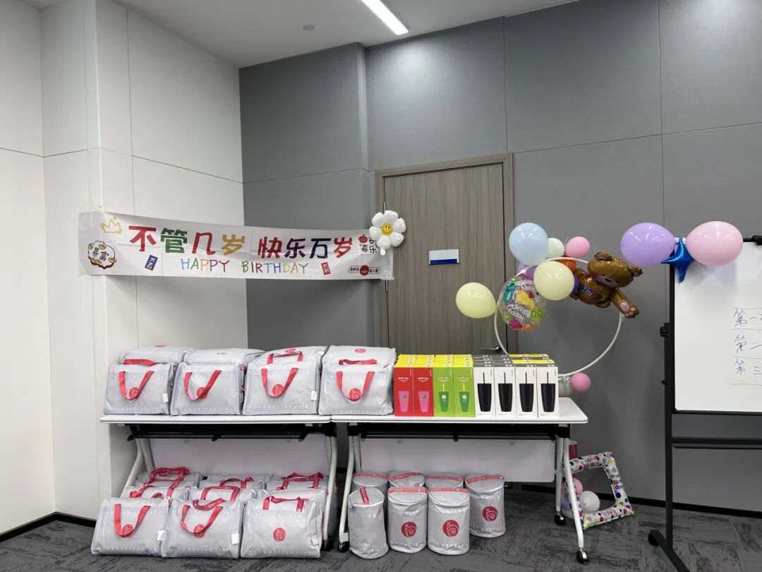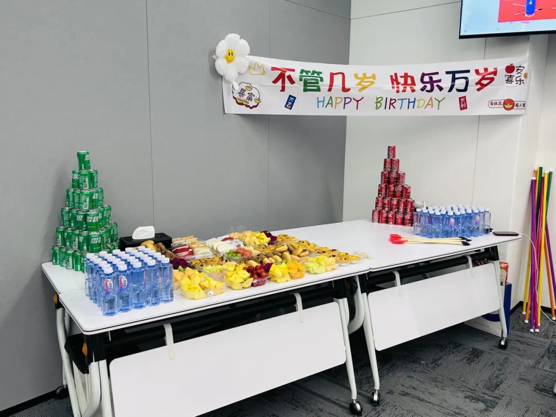 行政部的小姐姐们精心准备了零食和生物礼物,将活动会场布置得颇有生日氛围。