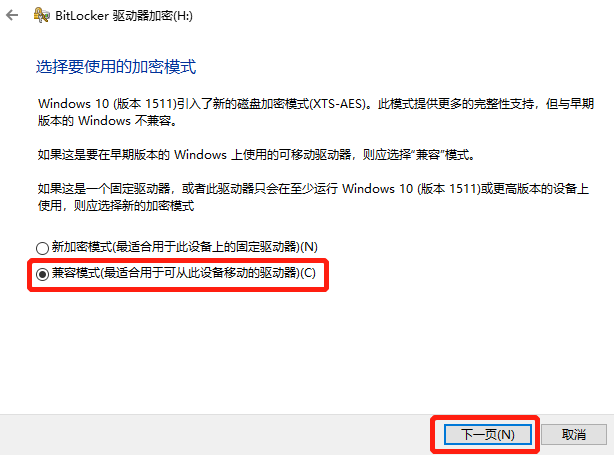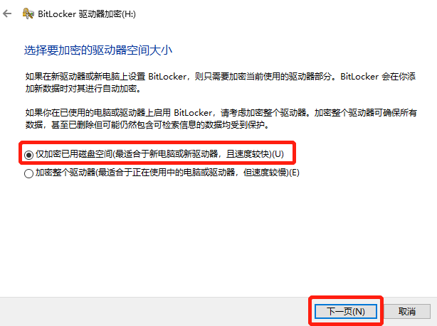 4.保存后,进行驱动器空间大小、加密模式选择,设置好后点击【下一页】并【开始加密】。