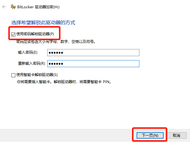 2.接着会弹出【BitLocker驱动器加密】窗口,勾选“使用密码解锁驱动器”,然后输入密码并点击【下一页】。