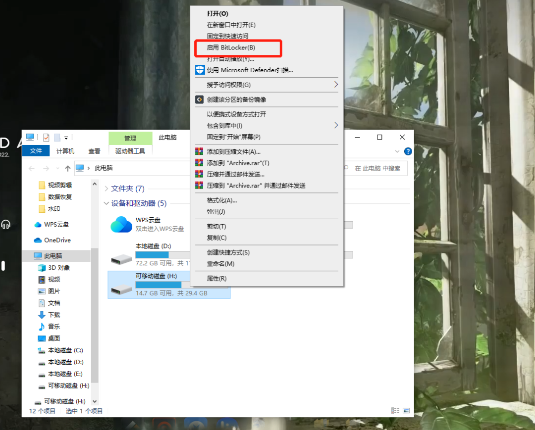 1.将U盘插入电脑并正常识别,打开【此电脑】,右击U盘盘符,在下拉选项中点击【启用BitLocker】。(注:Windows7-10家庭版操作系统不支持加密)