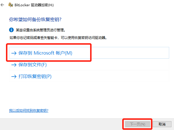 3.选择备份恢复密钥的模式为“保存到账户或者文件”都可以,点击【下一页】并进行保存。