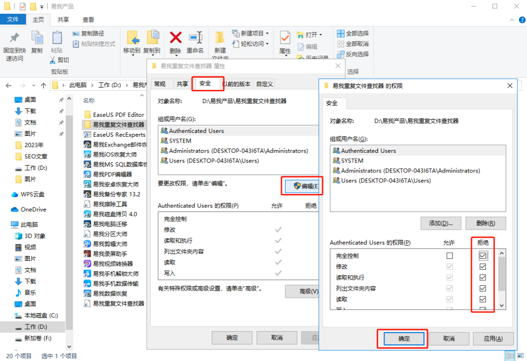 右键单击文件夹,选择【属性】-【安全】-【编辑】,将下面的选项全部勾选为“拒绝”就可以了。