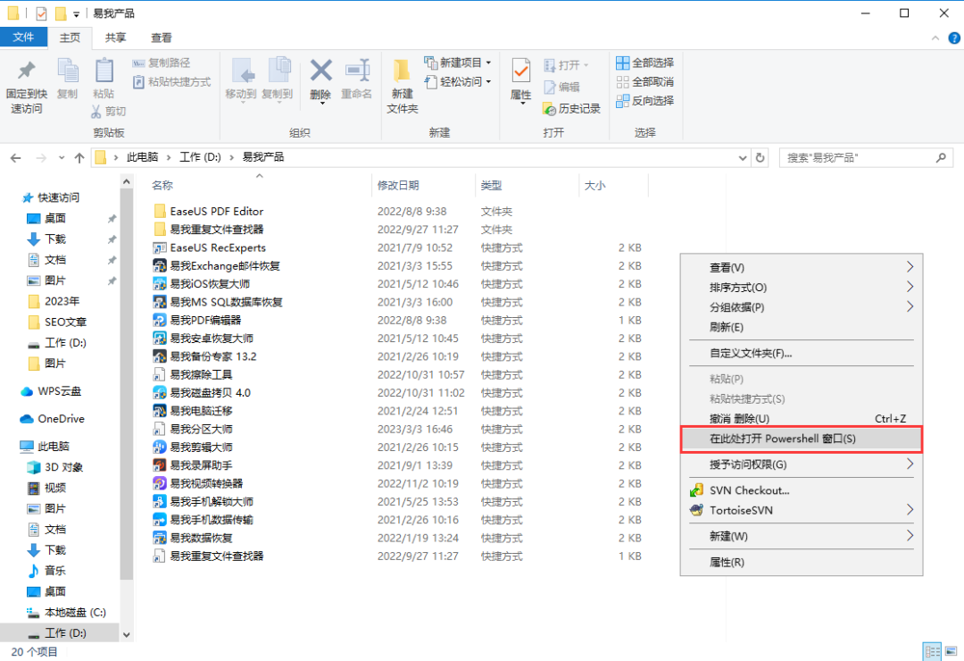 打开要隐藏的文件的文件夹,将鼠标移到空白区域,按住shift同时鼠标右击,然后选择下拉框中的“在此处打开Powershell窗口(S)”。
