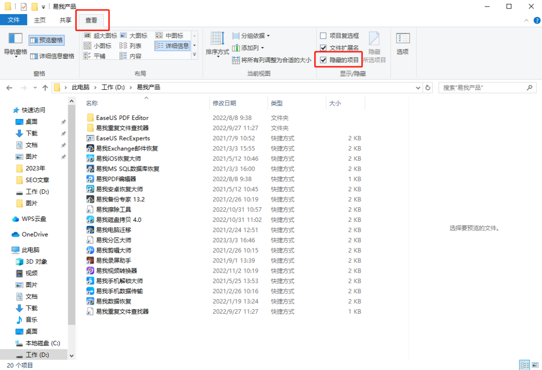 那么如何查看隐藏的文件夹呢?只需要打开文件夹页面,点击【查看】并勾选【隐藏的项目】,隐藏的文件夹就出来了。