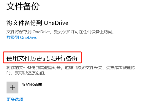 在文件备份选项卡下,可以看到“文件历史记录”按钮。如果尚未设置,点击“添加驱动器”来选择备份目标。