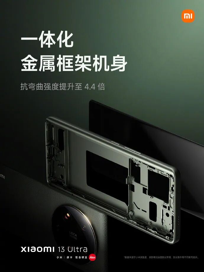 小米 13 Ultra摆脱了传统双曲面的中框的设计范式,致敬了徕卡经典M系列的外形,将两侧的金属延伸至机身背部4.4mm,一体化金属框架机身让整机的抗弯曲强度提升至4.4倍。