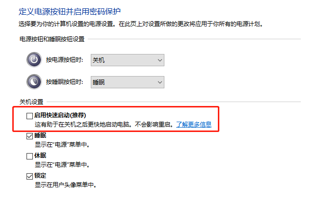 4.关机设置下,【取消勾选】启用快速启动(推荐),最后,点击【保存修改】即可。