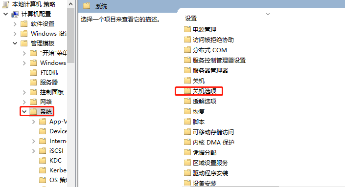 2.依次点击【计算机配置>管理模板>系统】,右侧找到并双击【关机选项】。
