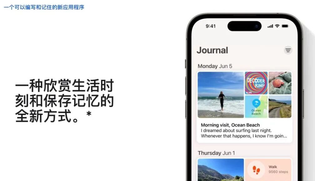 用户可以选择想要的内容保存到手记应用中,包括照片、音乐、录音、博客在内多种类型,此外,该应用还会根据用户的照片、音乐、锻炼等创建个性化的时刻建议,供用户记录。