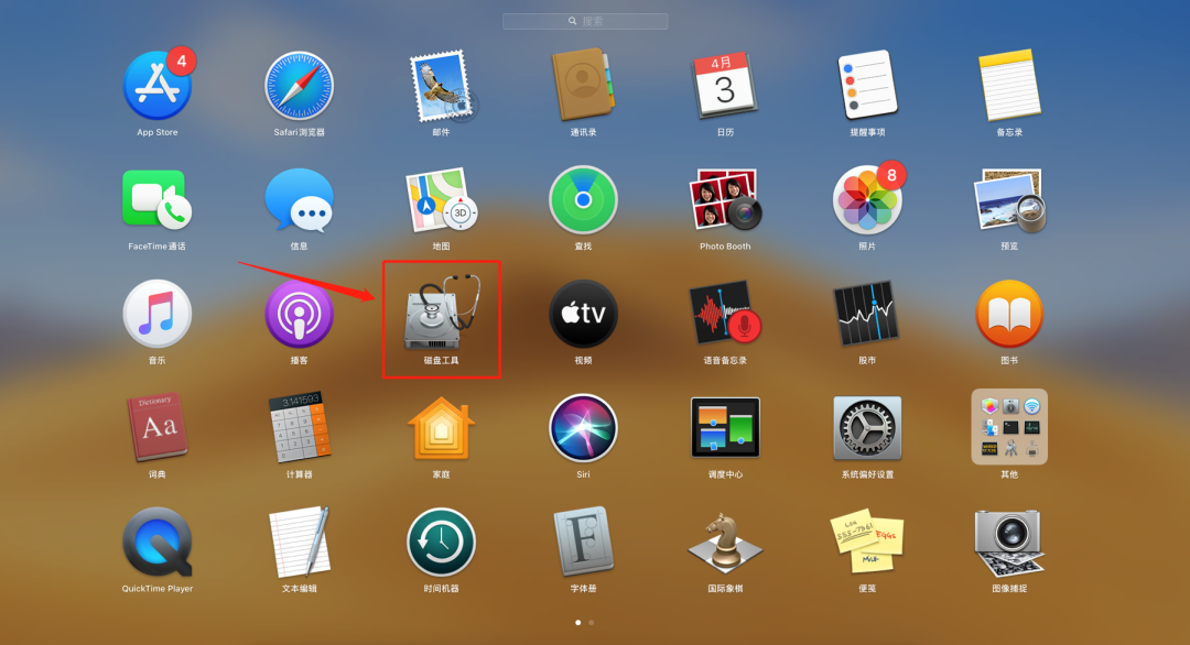 1.在启动台中,找到「磁盘工具」并点击打开;