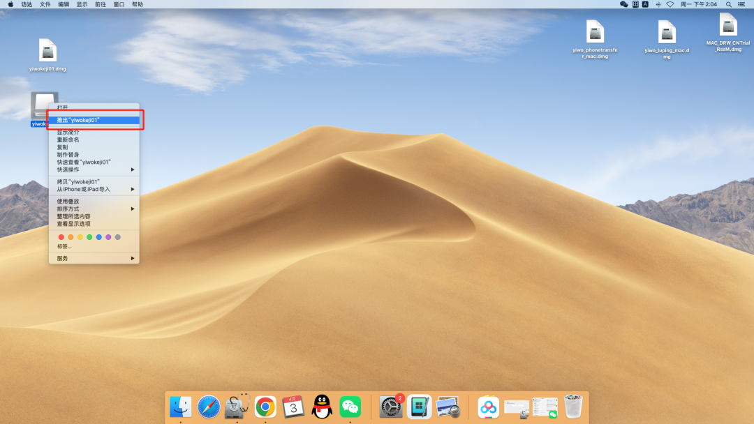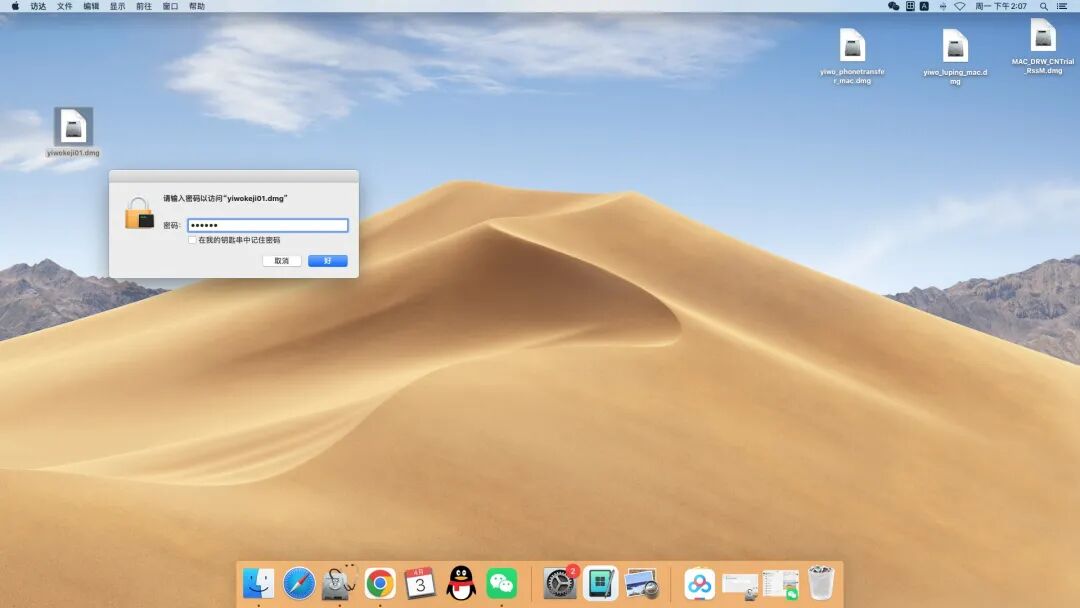 8.当我们下次需要访问加密文件时,直接点击“yiwokeji01.dmg”,在弹出的窗口输入密码就可以了。