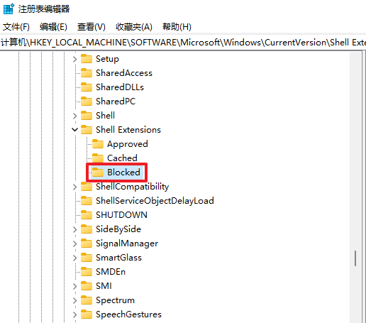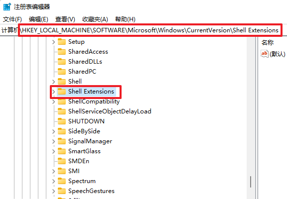 ②在注册编辑器中,依次点击计算机\HKEY_LOCAL_MACHINE\SOFTWARE\Microsoft\Windows\CurrentVersion\Shell Extensions路径。