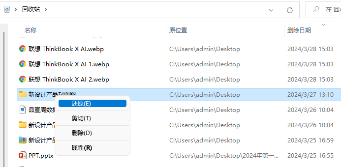 当电脑卡死时,文件可能被移动到回收站。直接打开回收站,查找丢失的文件夹,选中并右键,选择“还原”。