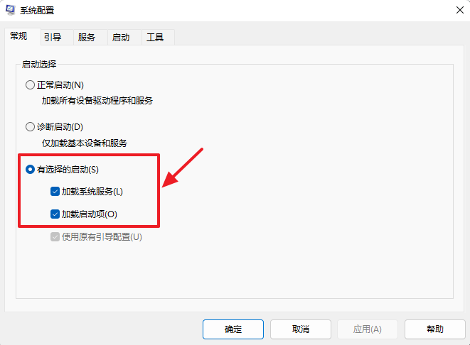 ③在“系统配置”页面中,勾选“有选择的启动”,取消“加载启动项”。