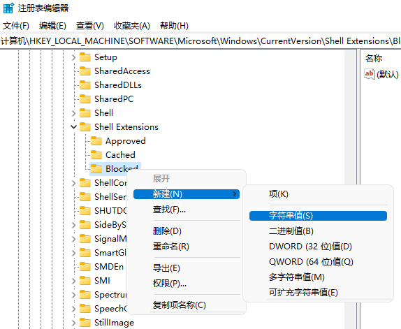 ⑤选中“Blocked”文件夹并右键,在弹出的快捷菜单中选择“新建”,在二级菜单中选择“字符串值”。