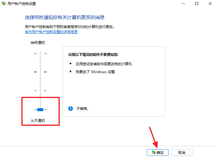 ⑤将左侧滑块拖动到最底部“从不通知”,并且点击“确定”按钮。