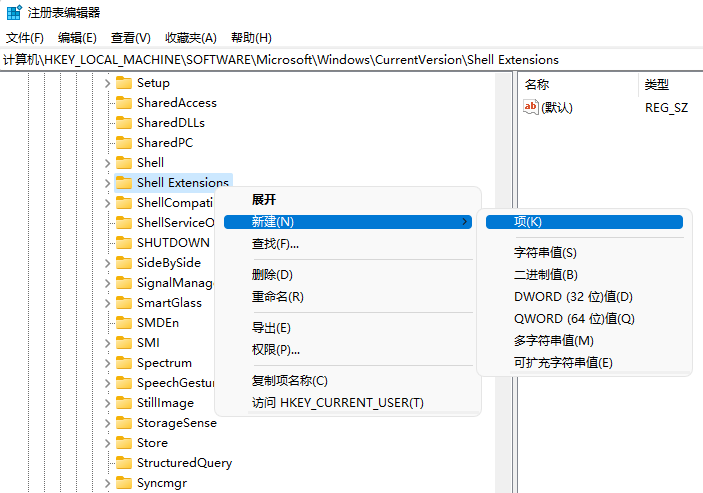 ③选中ShellExtensions并右键,在弹出的快捷菜单中选择“新建”,在弹出的二级菜单中选择“项”。