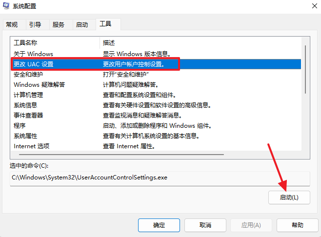 ④切换到“工具”栏中,选择“更改UAC设置”,并点击“启动”按钮。