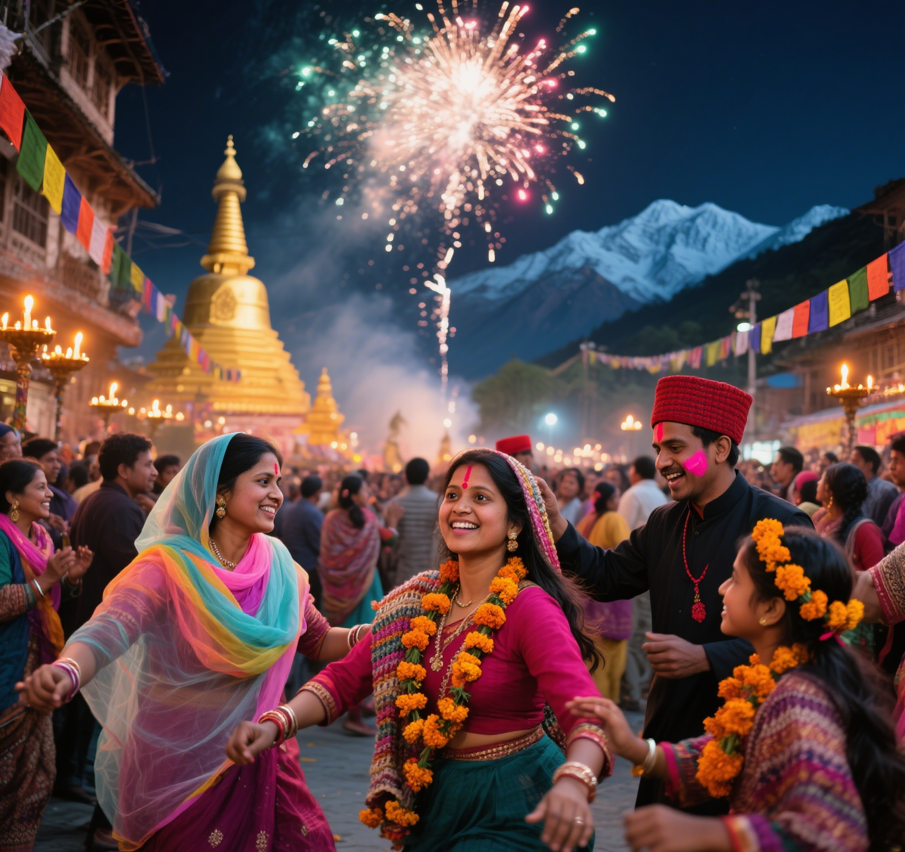 新年期间,街头巷尾热闹非凡。色彩斑斓的花车缓缓驶过,花车上装饰着缤纷花朵与精美织物,乐手们奏响欢快的传统乐曲,舞者们身着绚丽服饰,以热情奔放的舞姿展现尼泊尔风情,吸引着民众纷纷涌上街头,跟随着节奏载歌载舞。传统体育赛事也是新年庆祝的重要部分,比如在著名的 Ghode Jatra 赛马节,骑手们英姿飒爽,与骏马默契配合,展现出高超骑术,现场观众欢呼声、呐喊声此起彼伏 。