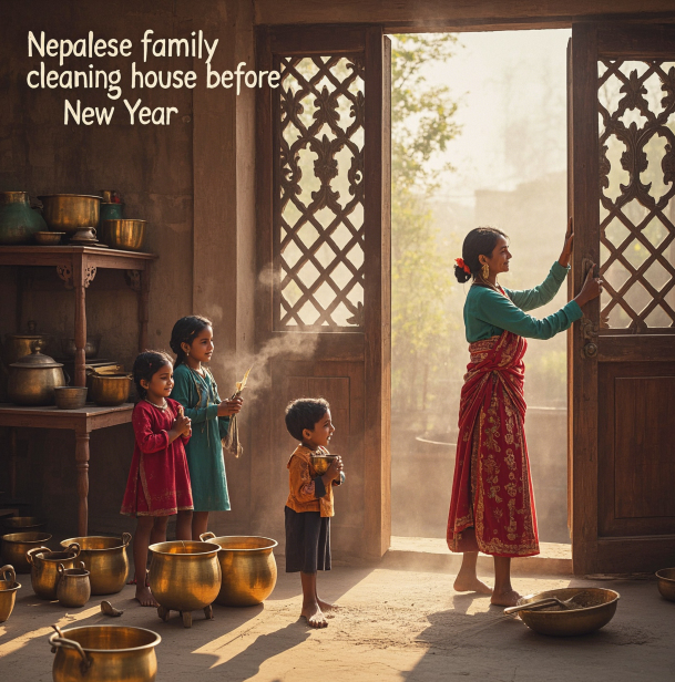 新年前夕,尼泊尔家家户户都会进行全面大扫除,清扫每一个角落,掸去旧年的灰尘,以全新的面貌迎接新年。人们用彩色粉末、米粒等精心绘制 “rangoli” 图案装饰房屋,这些精美的图案或呈几何形状,或似灵动花鸟,象征着吉祥与对新一年美好生活的期许 。孩子们也参与其中,他们穿上崭新的衣裳,拿着长辈给的零花钱,欢快地穿梭在集市,挑选心仪的零食和玩具,为节日添上一抹纯真与活力。