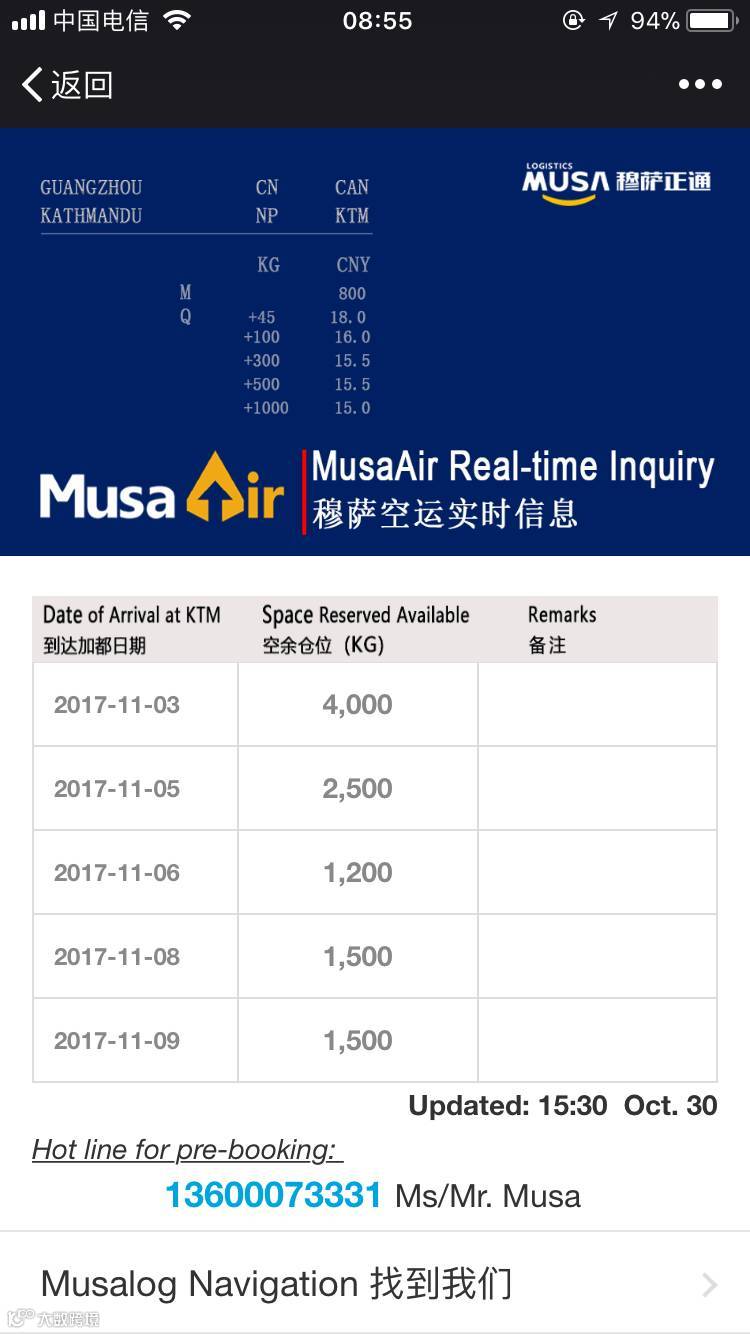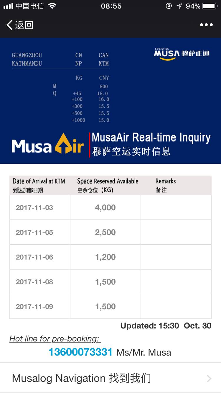 穆萨空运实时信息上线啦!长按上图二维码识别, 或者保存图片,或者扫描, 你就可以轻松进入穆萨空运为您提供的广州至加德满都空运实时信息了。