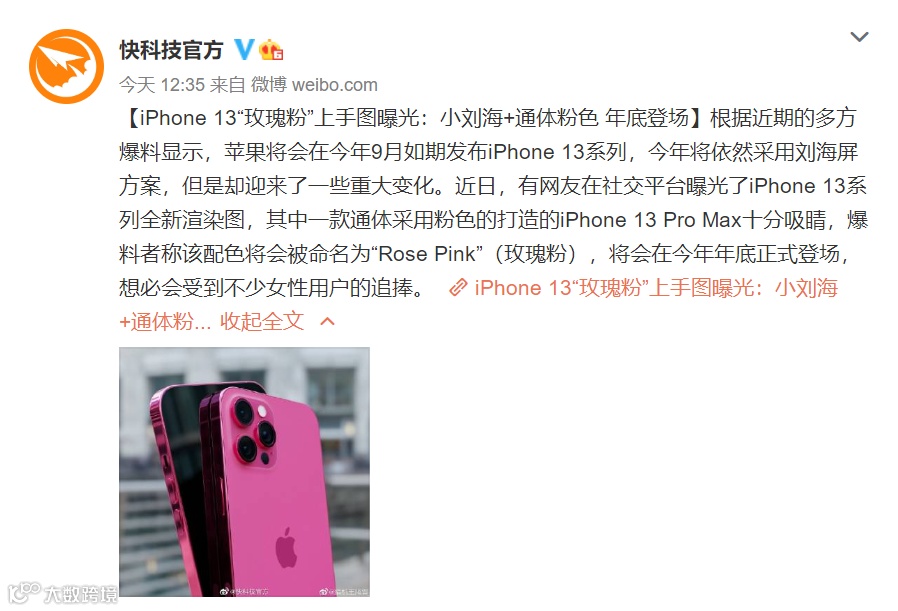 关于发售日期,根据@Peng Phones的说法,这个配色的iPhone 13 Pro Max将在2021年12月发售。@快科技官方也发布微博称将于年底发布。