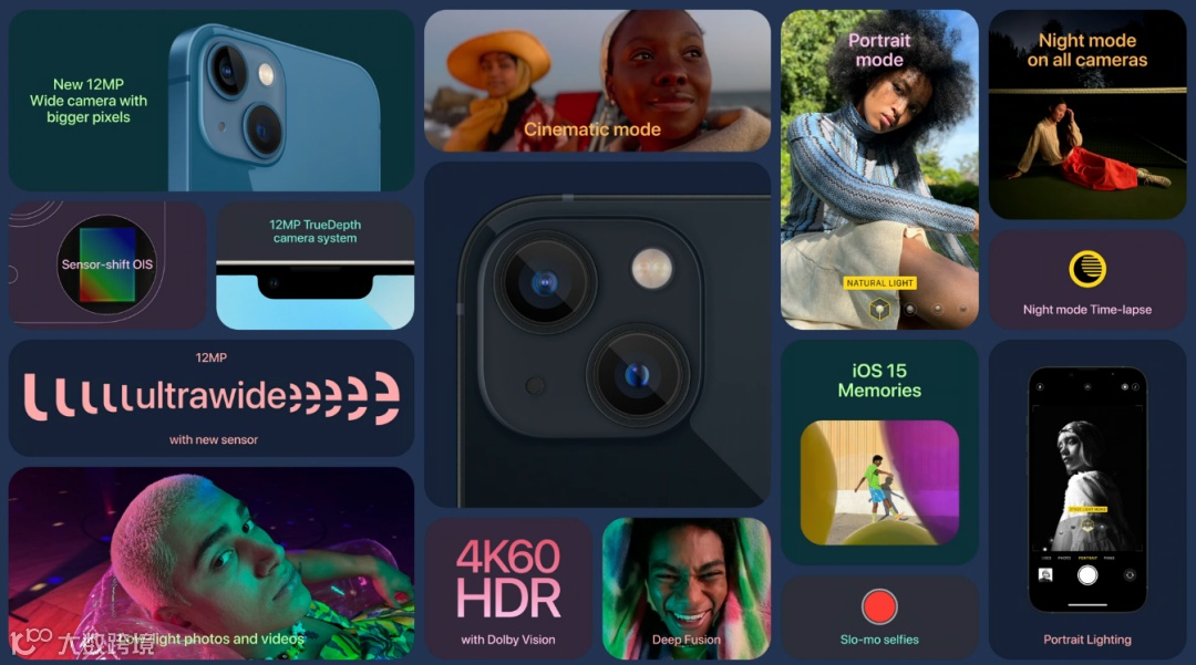 iPhone 13和Mini都采用了后置双1200万双摄规格,主摄1200万像素,1.7um、1/1.7英寸、f/1.6光圈,进光量提升47%。iPhone 13搭载的超广角镜头(5P)为1200万像素,120°广视野。此外,去年顶配独享的位移防抖功能今年直接普及到了iPhone 13全系中。