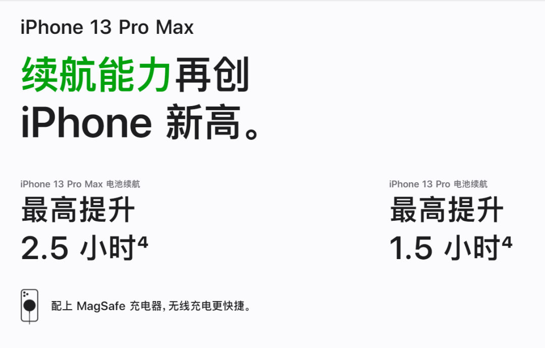 iPhone 13 Pro将提供比iPhone 12 Pro长1.5小时以上的续航时间,而iPhone 13 Pro Max的续航时间大约比12 Pro Max长2.5小时。