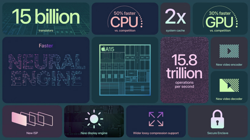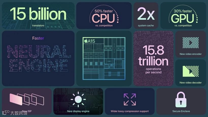 搭载了全新的A15仿生处理器,5nm工艺,集成了150亿晶体管,全新6核心设计(2个大核+4个小核)以及4核GPU+16核神经引擎,图形处理速度比友商快30%。
