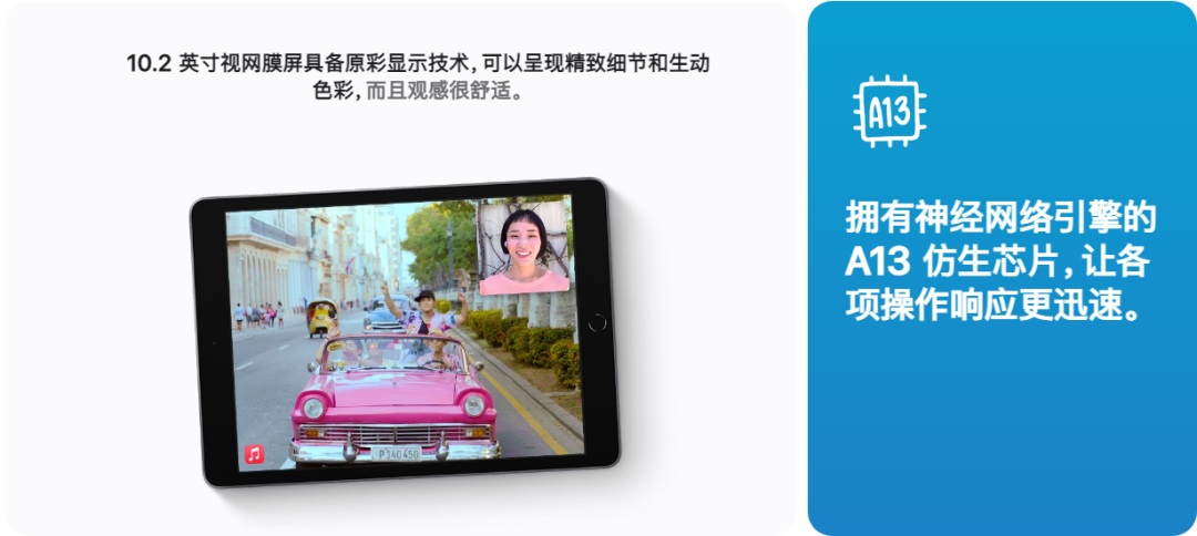 A13仿生芯片,性能较上一代机型提升最高可达20%。这使得新款iPad的芯片性能领先销量最高的Chromebook机型最高可达3倍,领先销量最高的安卓平板机型最高可达6倍。