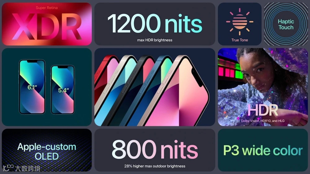采用Super Retina XDR OLED显示屏,亮度提升28%,全局亮度最高800nit,HDR模式亮度最高可达1200nit,支持杜比视界、HDR10、HLG模式,覆盖P3广色域。