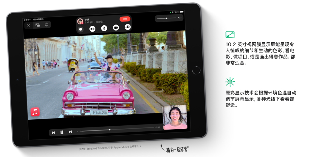 10.2英寸视网膜显示屏,首次支持原彩显示。原彩显示技术令新款iPad的画面显示效果更加自然,并在各种光线条件下让用户看东西更舒服。