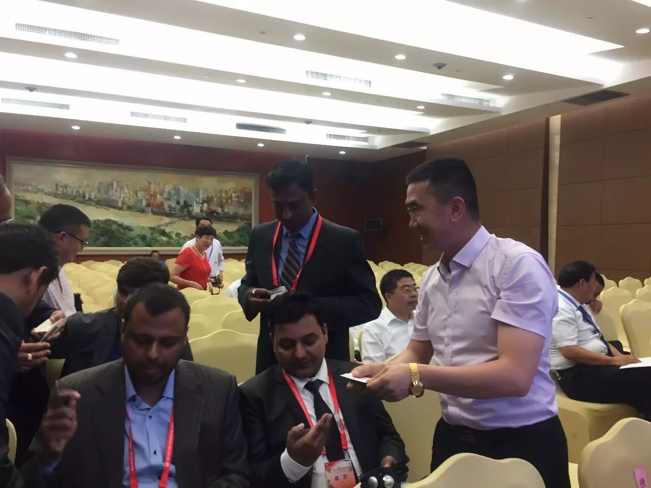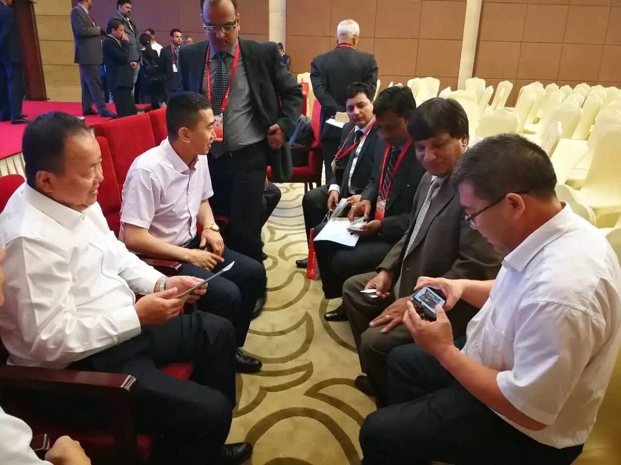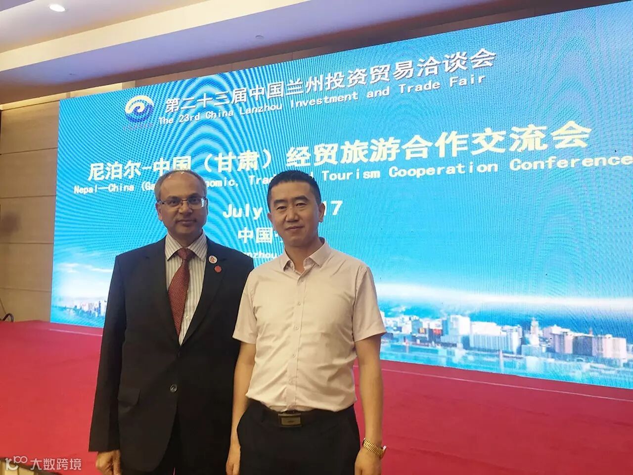 Nepal ambassador to the PRC Leela Mani Paudyal interviewing Mr. Zhang Shiping, general manager of Musa logistics before the conference. 经贸合作交接会前,尼泊尔驻华大使利拉·马尼·鲍德尔阁下与穆萨物流总经理张世平先生先“交流”了下。