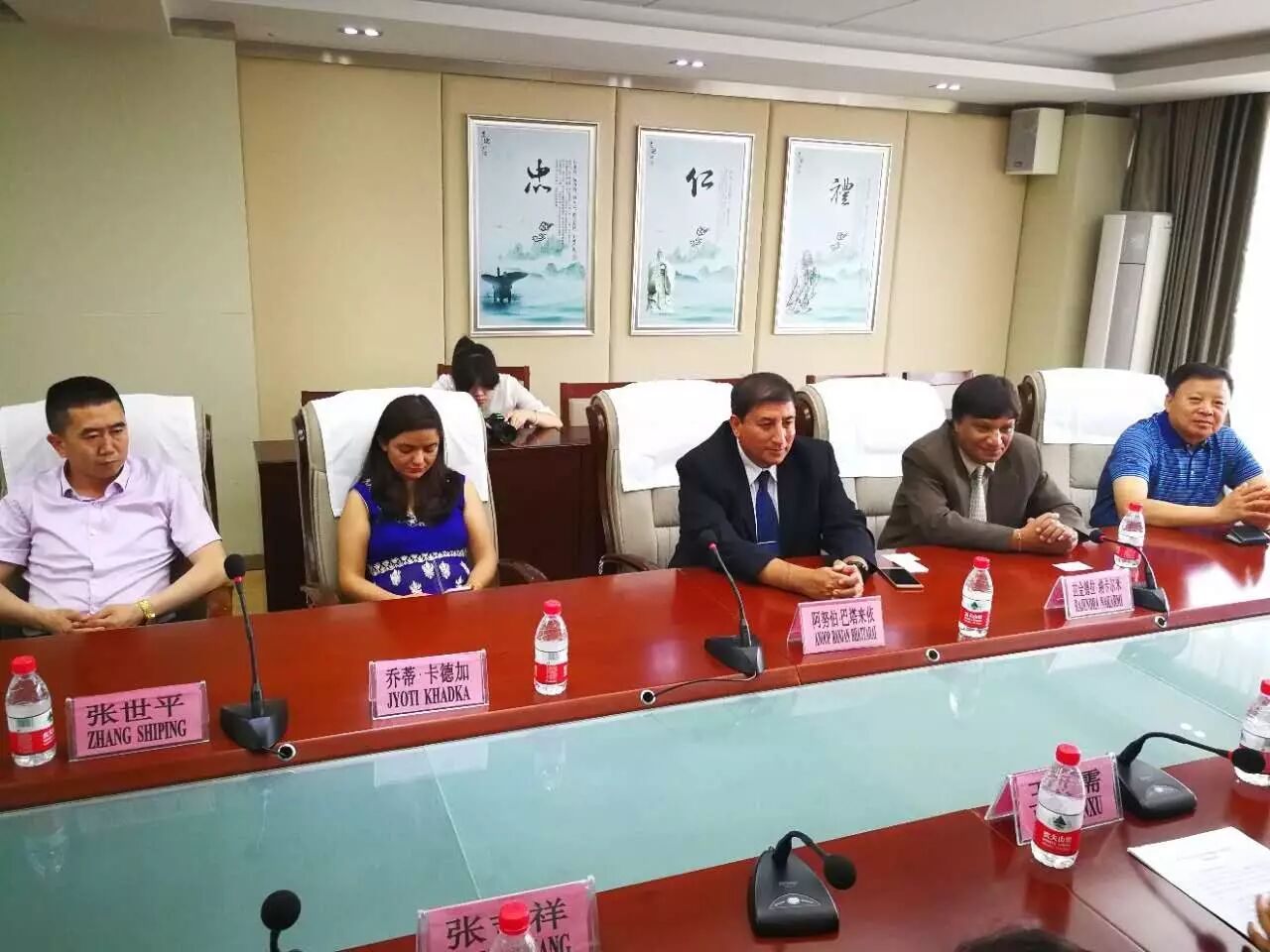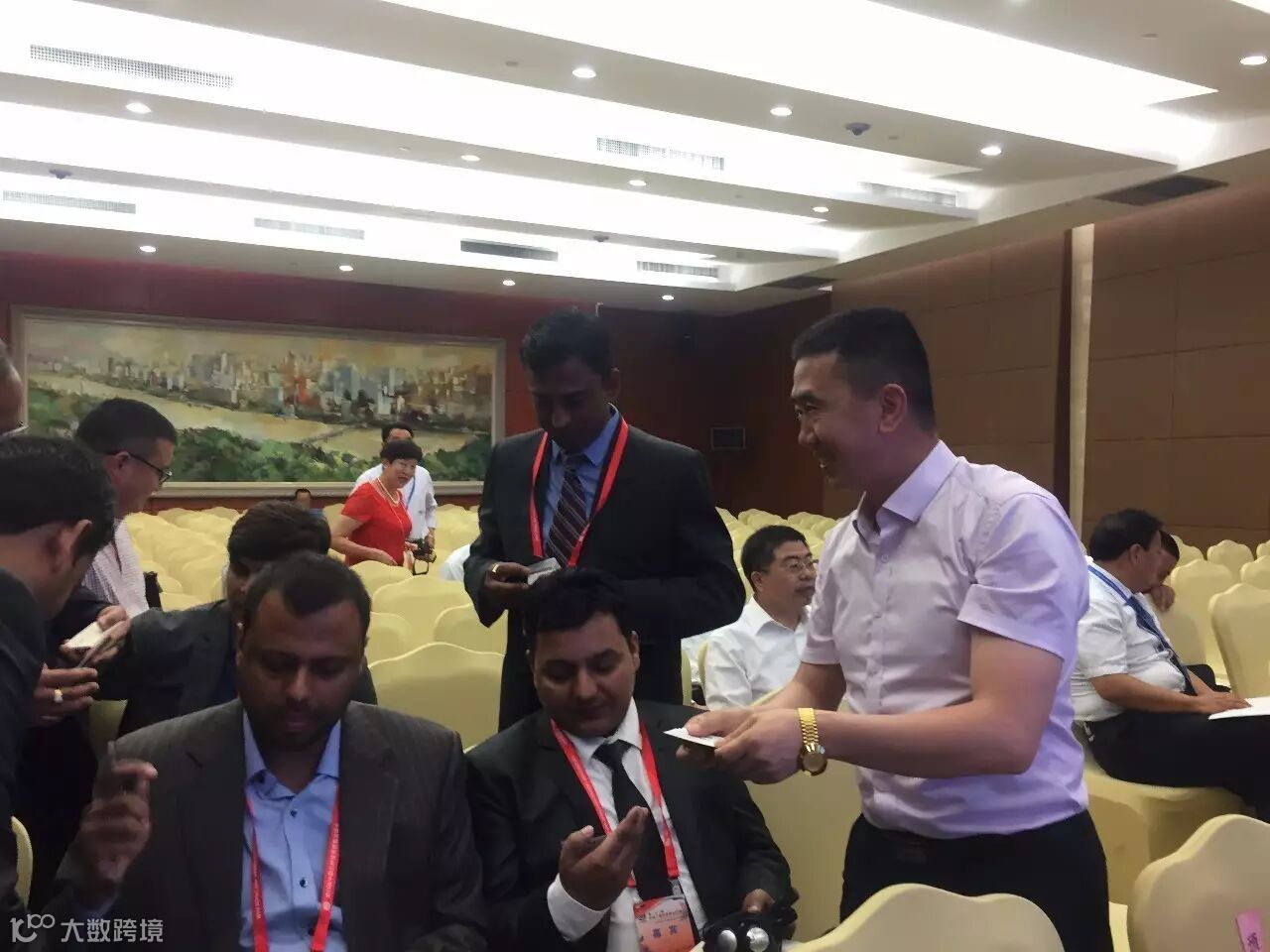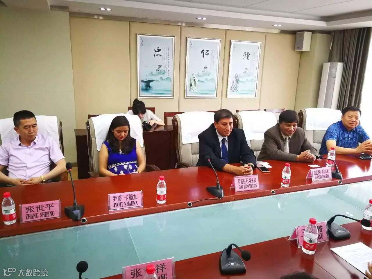 Nepal ambassador to the PRC Leela Mani Paudyal interviewing Mr. Zhang Shiping, general manager of Musa logistics before the conference. 经贸合作交接会前,尼泊尔驻华大使利拉·马尼·鲍德尔阁下与穆萨物流总经理张世平先生先“交流”了下。