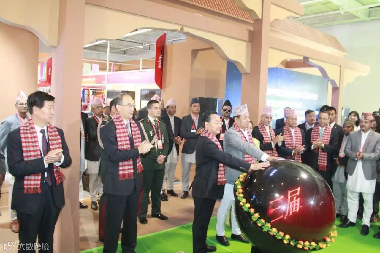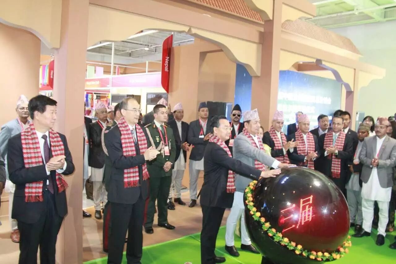 Nepal vice president Rt.Hon'ble Nanda Bahadur Pun kicking off Nepal Host Country Exhibition Hall. 南达·巴哈杜尔·普恩阁下为第23届兰洽会专设的尼泊尔主宾国展馆开馆。