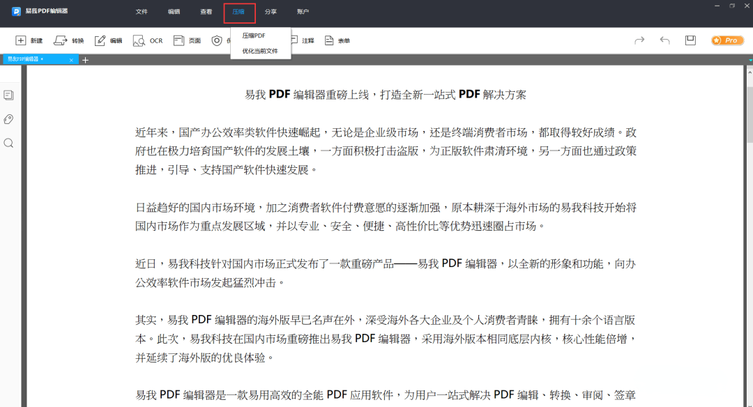 易我PDF编辑器是一款专业的PDF压缩工具,它提供了两种减小文件大小的方法,一种是直接压缩,另一种是对文件进行优化。
