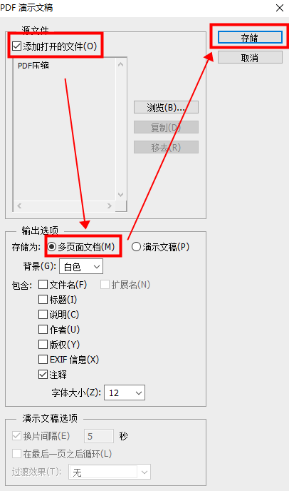 2.在弹出的页面勾选【添加打开的文件】,选择【多页面文档】并点击【存储】;