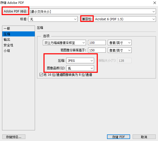 3.最后,在存储设置里,可以调整预设、兼容性和压缩设置等,从而实现不同程度的压缩效果。图片品质越低,文件压缩越小。